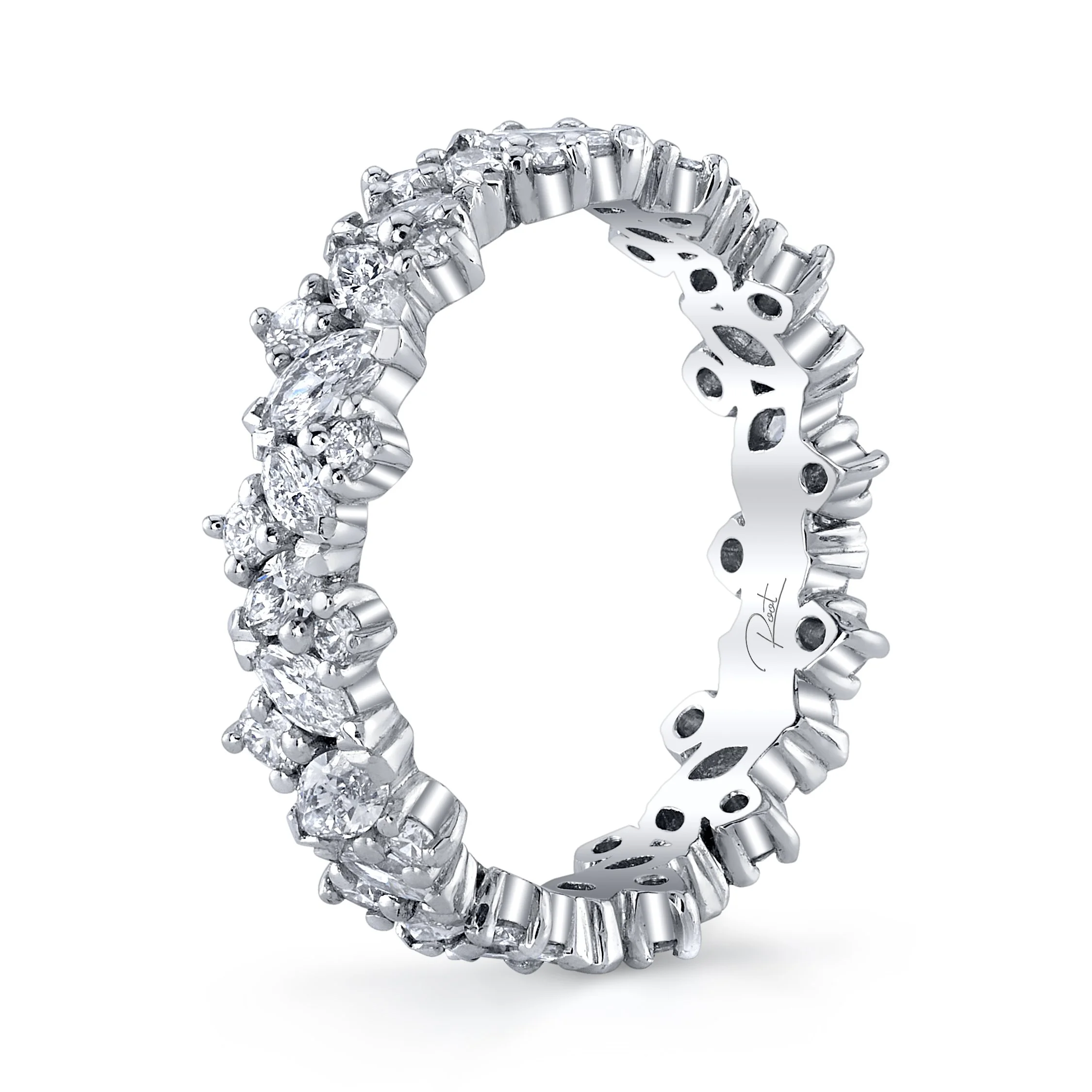 Platinum and diamond eternity band set with alternating marquise shape diamonds and ideal cut round brilliant diamonds. Custom made from start to finish in Austin, TX.