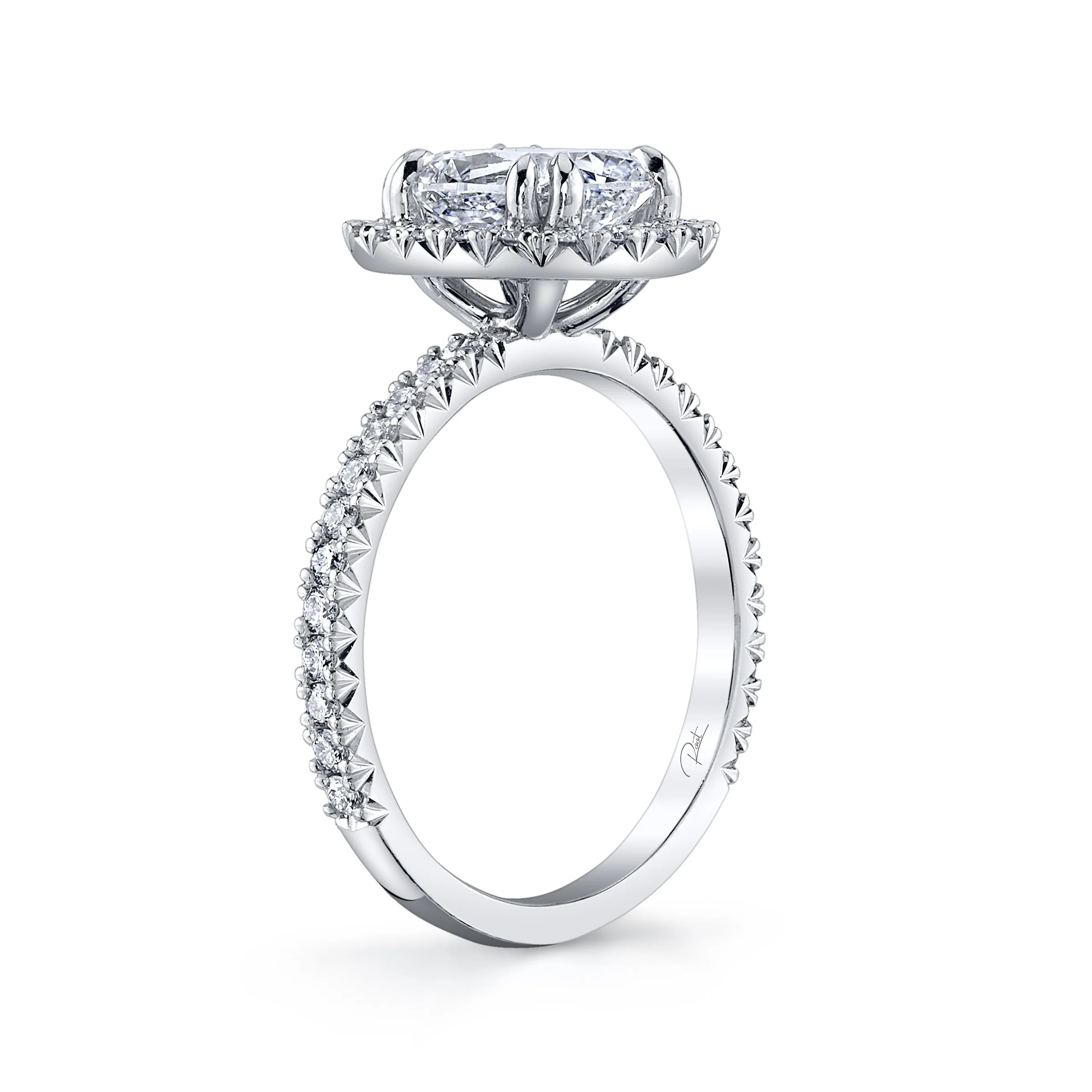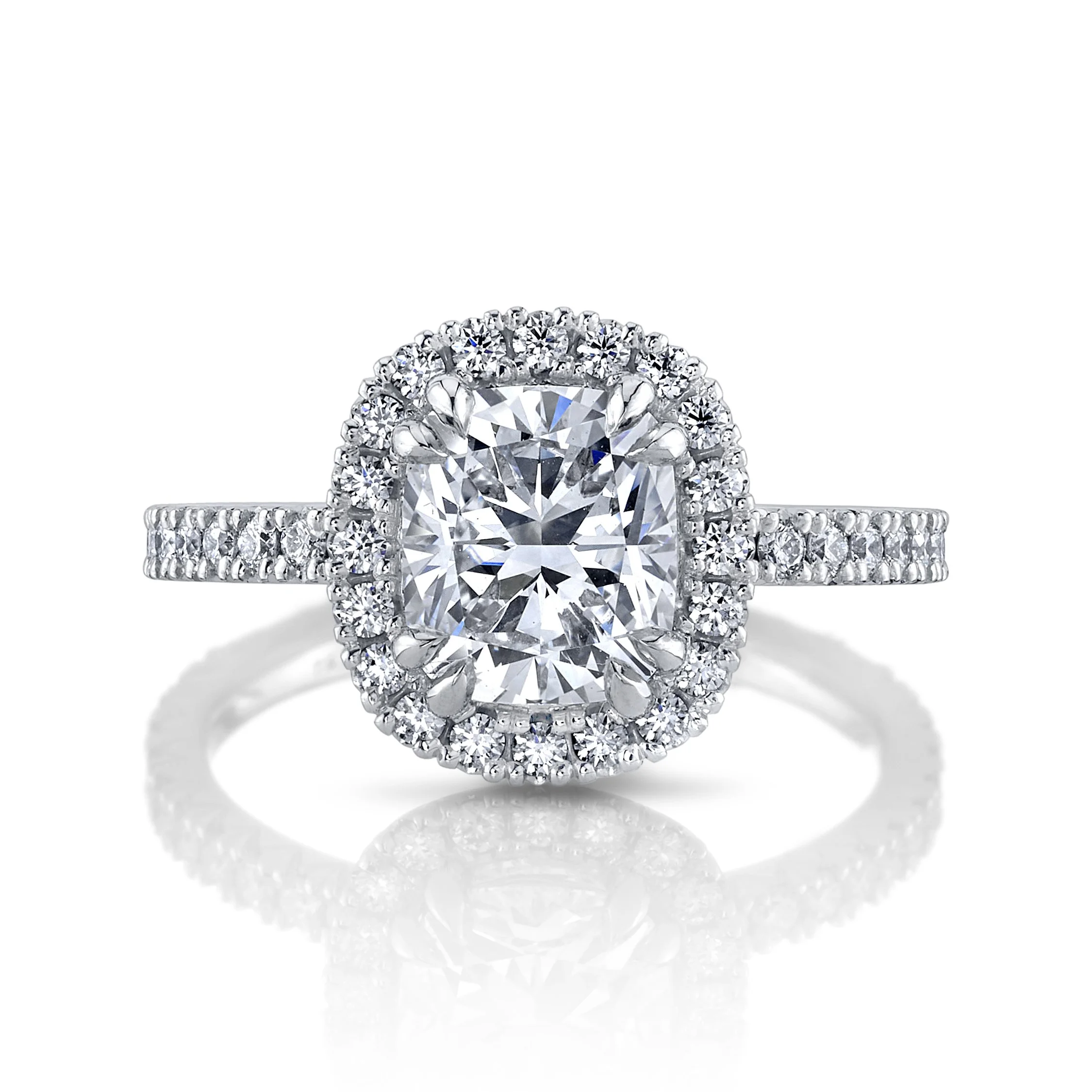 The halo style of engagement rings is not inherently unique, however there are many ways to make it one-of-a-kind. This ring features a beautiful cushion shape diamond center stone with double claw prongs, surrounded by French pavé set ideal cut diamonds. The platinum casting was produced in one solid piece using the most technologically advanced process, and the diamonds were then all set by hand into the metal. This halo engagement ring is truly one-of-a-kind.