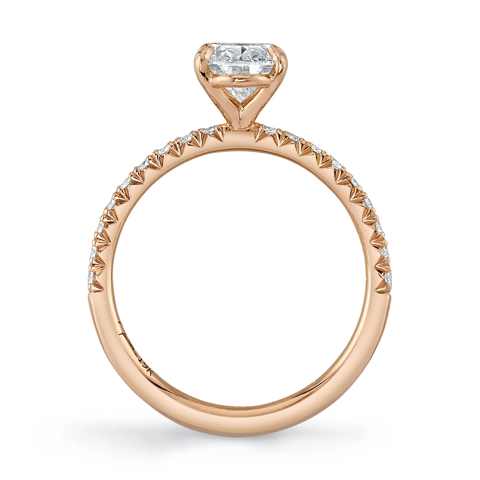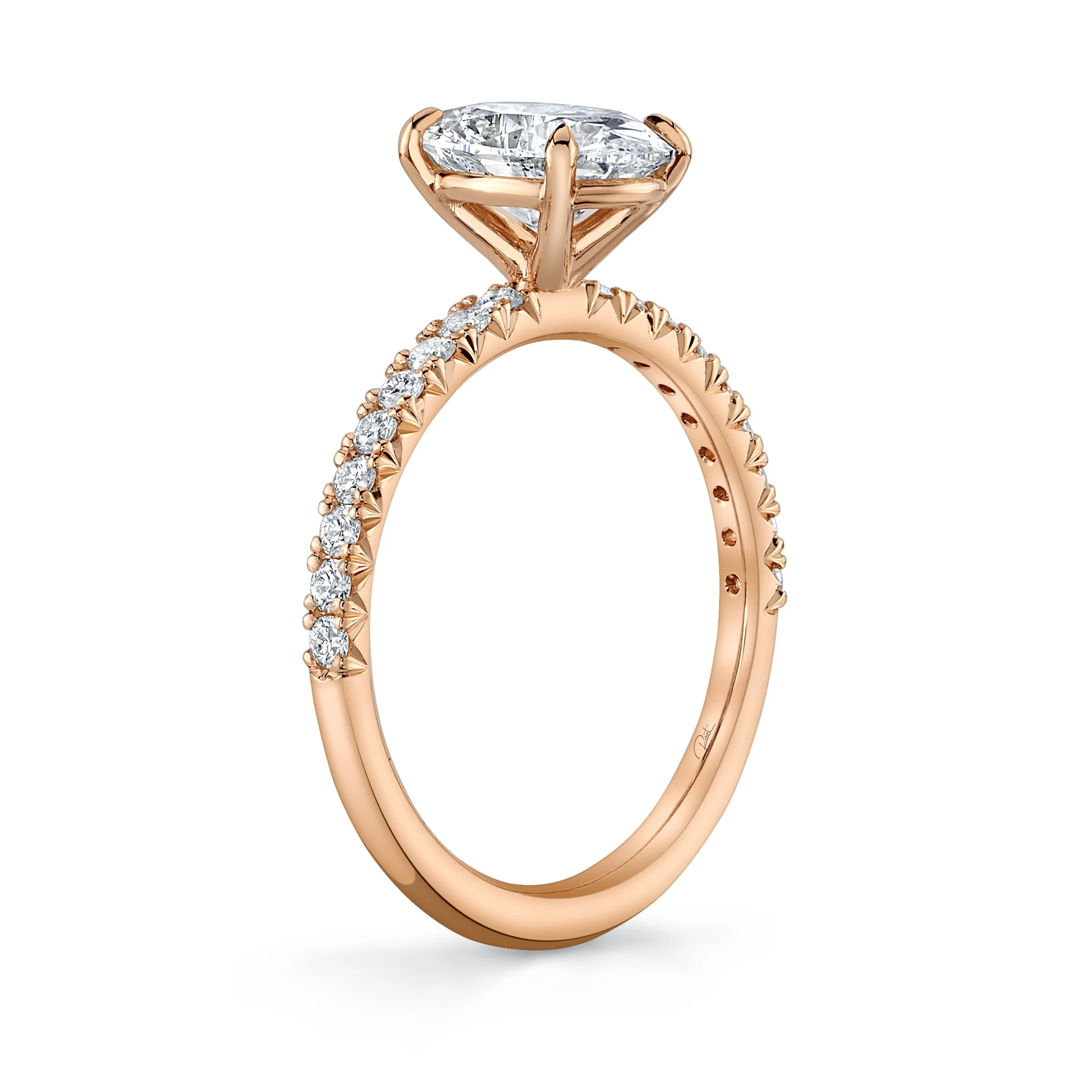 Custom made using our special 19 karat rose gold metal, this engagement ring is set with a one carat oval shape diamond center stone. It is accented with French Pavé set diamonds, all cut to ideal standards and set by hand. Everything about this custom engagement ring was done with intention, aiming for the highest quality possible.